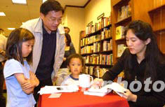 美籍女作家張純?nèi)缧伦鳌睹绹A人:口述歷史》簽名售書活動,四日晚在美西圣荷西的Barnes&Nobel書店舉行。她希望大家多買書送給圖書館,使更多人了解華人對美國的貢獻。圖為張純?nèi)鐬樵诠韫纫患腋呖萍脊緩氖卵邪l(fā)工作的唐若古先生及一雙兒女簽名。作者:陳鋼