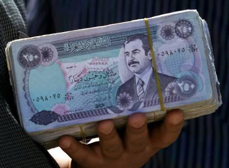 為緩和小面額鈔票緊缺,央行趕緊下令印制價(jià)值數(shù)百萬美元的紙鈔。這種紙鈔的畫面正是薩達(dá)姆年青,梳著整齊頭發(fā),扎著整齊領(lǐng)帶的照片。對此,央行官員無可奈何地表示:“這我們也沒有辦法,因?yàn)橐粫r(shí)半時(shí)根本來不及換印鈔版!(聞新芳)