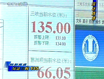 據(jù)三峽樞紐梯級調(diào)度中心肖主任介紹,因?yàn)殚L江上游普降中到大雨,增加了來水量,八日是上游來水量最多的一天,達(dá)到每秒一萬七千立方米,水位較前一日上升了三點(diǎn)五六米。但在控制范圍每天水位上升不超過五米之內(nèi),從六月一日到十日平均每天水位上升為三點(diǎn)零九米。