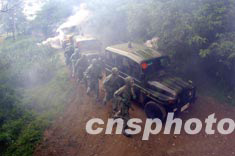 在全面防護(hù)下的中國(guó)海軍某防化部隊(duì),六月于江南某地進(jìn)行現(xiàn)代戰(zhàn)法演練,迅速通過“戰(zhàn)地”污染區(qū)。作者:楊波