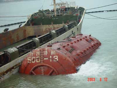 “華頂山”號(hào)沉沒(méi)后,海事部門決定采取“浮筒打撈法”,也就是將4只浮力總計(jì)2000噸的浮筒固定在沉船兩側(cè),然后向浮筒內(nèi)注入壓縮空氣,讓沉船與浮筒一起浮出水面。經(jīng)過(guò)救撈人員連續(xù)數(shù)日的緊張調(diào)試安裝,昨天下午,壓縮空氣被注入浮筒,沉默在水中15天的“華頂山”號(hào)終于慢慢浮出水面。(劉立忠、王蔚然)