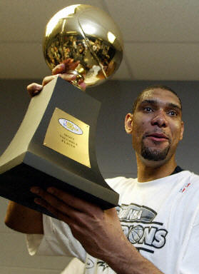 這也是馬刺隊史上第二座總冠軍,鄧肯獲選最有價值球員(MVP)。鄧肯毫無意外拿下決賽最有價值球員獎,他在這個系列戰(zhàn)中,平均攻下二十四點二分,抓下十七個籃板,送出五點三次助攻以及五點三次阻攻,其中季后賽總阻攻數一百三十一次,刷新NBA季后賽紀錄,而今天單場八次阻攻,也追平了總冠軍賽單場阻攻紀錄。