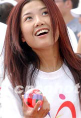 香港歌手黃蓉,2003年6月22日在香港維多利亞公園舉行的“同心攜手畫出彩虹”嘉年華活動(dòng)上,興高采烈拋彩球祈盼萬事如意。中新社記者 錢興強(qiáng)