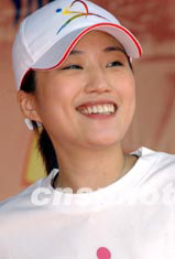 香港藝員谷祖琳,2003年6月22日在香港維多利亞公園舉行的“同心攜手畫出彩虹”嘉年華活動(dòng)上,為賓客們演唱歌曲。中新社記者 錢興強(qiáng)