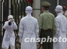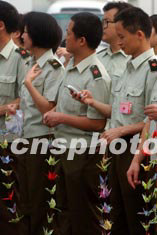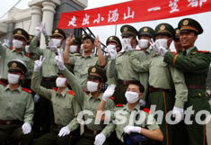 北京小湯山醫(yī)治非典戰(zhàn)地醫(yī)院的警衛(wèi)官兵完成五十余天的任務后,六月中下旬撤離前拍照留念。中新社記者:賈國榮