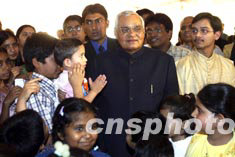 印度總理瓦杰帕伊二十三日在北京出席印度駐華使館新址奠基揭幕儀式時(shí),與在華的印度兒童簇?fù)斫徽。中新社記?毛建軍