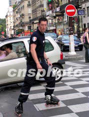 2003年6月的法國巴黎,天氣晴朗,一名警察腳踏排輪穿梭街道巡邏,以快速應(yīng)變狀態(tài)對付罪案發(fā)生。盧峰 攝