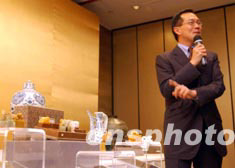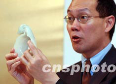 香港佳士得2003年春季拍賣會之《中國宮廷御制藝術(shù)精品》因受SARS影響延遲至7月7日舉行,亞洲區(qū)主席林華田6月26日介紹一套珍貴的清朝康熙御用田黃玉石印章,估價成交逾二千萬港元。中新社記者 洪少葵