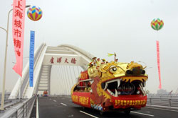 中新網(wǎng)6月28日電 世界上跨度最大的鋼拱橋——上海盧浦大橋,二十八日上午正式建成通車(chē),小巨人姚明帶領(lǐng)千名中外長(zhǎng)跑愛(ài)好者參加了主題為“活力上海,奔向未來(lái)”跨橋長(zhǎng)跑活動(dòng)。
