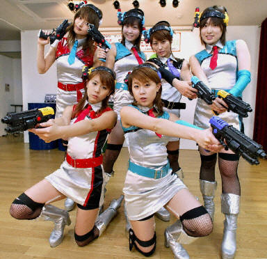28日,日本青春少女為TOMY玩具公司新近推出的紅外玩具槍在東京做促銷。這種叫作'Survivor Shot Revolv'的紅外玩具槍還包括一個無線接收器,日本市場售價2580日元(25美元)