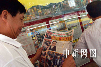 香港媒體關(guān)注國務(wù)院總理溫家寶訪港。香港媒體關(guān)注中國國務(wù)院總理溫家寶訪港,29日報(bào)刊雜志頭條刊登新聞,市民駐足瀏覽。中新社記者洪少葵攝
