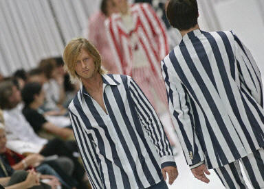 6月29日在法國巴黎舉行了2004春夏流行男裝發(fā)布會。圖為模特們展示英國設計師保羅·史密斯的時裝作品。