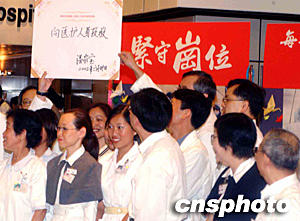 國(guó)務(wù)院總理溫家寶,三十日到首先爆發(fā)非典型肺炎的沙田威爾斯親王醫(yī)院探訪,溫家寶對(duì)于因?yàn)橥炀炔∪诵悦鵂奚尼t(yī)護(hù)人員,他銘記于心 。并即場(chǎng)寫上「向醫(yī)護(hù)人員致敬」的題字。中新社記者 錢興強(qiáng) 攝