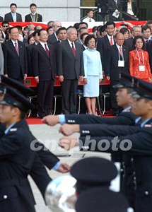 香港灣仔金紫荊廣場(chǎng)今早舉行升旗儀式。當(dāng)國(guó)務(wù)院總理溫家寶在特區(qū)行政長(zhǎng)官董建華陪同下步入廣場(chǎng)時(shí),全場(chǎng)響起熱烈的掌聲。升旗儀式有三千名嘉賓參加,由香港警察銀樂隊(duì)奏樂。