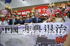 今年春天,北京突發(fā)“非典”疫情,首都旅游及相關(guān)產(chǎn)業(yè)遭受到了災(zāi)難性的打擊,來京的海外游客數(shù)量大幅下降,經(jīng)濟(jì)損失十分嚴(yán)重。為了盡快復(fù)蘇旅游市場(chǎng),北京市旅游局制定了一系列救市措施,其中就包括今天的第一團(tuán)歡迎儀式。