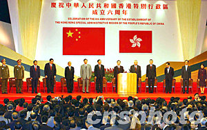 溫家寶扼要回顧了香港回歸六年來(lái)走過(guò)的不平凡歷程。他形容∶香港像一艘啟錨的巨輪,穿過(guò)急流險(xiǎn)灘,破浪前進(jìn)。