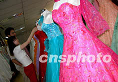 一對戀人七月初在北京一家婚紗店內挑選自己喜歡的樣式。北京“雙解除”后,婚紗禮服市場逐步復蘇。中新社記者 張勤 攝