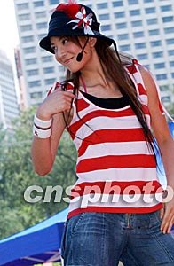 香港歌手鄭希怡,7月1日在維園舉辦慶祝香港回歸祖國(guó)活動(dòng)中,載歌載舞表演助興。洪少葵 攝