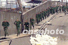 二日中午,上海地鐵四號線險情經(jīng)過多方晝夜努力,基本得到控制。七月一日九時許,流沙涌入建設(shè)中的上海地鐵四號線(浦東南路至南浦大橋)區(qū)間隧道中的浦西聯(lián)絡(luò)通道,造成嚴(yán)重的地面沉降。圖為武警戰(zhàn)士火速趕赴事故現(xiàn)場參與救災(zāi)工作。中新社圖