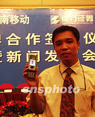 海南移動與南方證券七月二日在?谂e行合作開發(fā)GPRS手機(jī)炒股新業(yè)務(wù)簽字儀式。該業(yè)務(wù)開海南電信業(yè)和證券業(yè)合作的先河。圖為儀式上海南移動工作人員展示股票圖形。作者:王辛莉