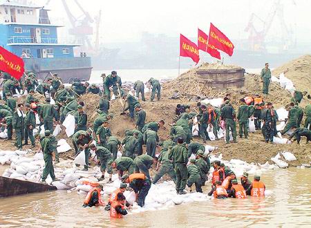 記者今天上午在現(xiàn)場看到武警上?傟牭9支隊3中隊的數(shù)百名官兵身穿桔紅色救生衣,有的在碼頭上搬運沙袋,有的站在齊腰深的積水里修筑堤壩。這些戰(zhàn)士們從昨天凌晨進入現(xiàn)場搶險后,分批投入戰(zhàn)斗,至記者發(fā)稿時已經(jīng)連續(xù)戰(zhàn)斗了30多個小時。