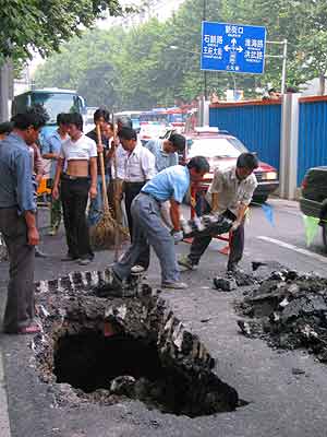 中新網(wǎng)7月4日電 據(jù)南京現(xiàn)代快報(bào)報(bào)道,昨日下午,南京新街口附近兩處路面發(fā)生塌陷。塌陷雖與地鐵建設(shè)沒有直接的關(guān)系,但給南京地鐵建設(shè)部門敲響了警鐘,負(fù)責(zé)地鐵建設(shè)的有關(guān)人士稱,在前期預(yù)防的基礎(chǔ)上,針對(duì)近期的梅雨,他們制定了防范措施。