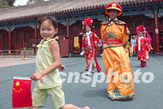 身穿清代服裝的游客七月四日在北京故宮午門前準(zhǔn)備拍照。隨著北京故宮旅游的逐漸復(fù)蘇,受非典影響停業(yè)兩個多月的古裝攝影也開始恢復(fù)營業(yè)。中新社記者 張煒 攝