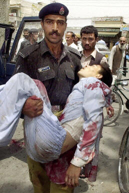 巴基斯坦西南部城市基達(dá)的一個什葉派穆斯林的清真寺內(nèi)4日發(fā)生自殺爆炸事件,至少15人死亡,數(shù)十人受傷。圖為巴基斯坦警察正在運送受傷人員。