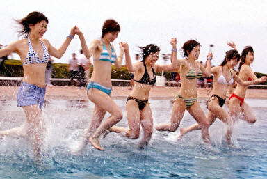 7月5日在東京西部一個(gè)小鎮(zhèn),大約有3,600名游客來此游泳。東京地區(qū)的溫度高達(dá)30度。圖為穿著性感比基尼的日本女孩高興的奔向游泳池。