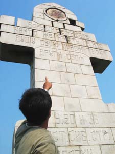 這座由沙俄建立的紀(jì)念碑呈十字架形,高6米,寬0.7米,以灰白色花崗巖砌筑,碑的上端鑲嵌著圓形彩色“圣母”頭像,下面鐫刻著俄文。日期為1904至1905年,即“日俄戰(zhàn)爭(zhēng)”的時(shí)間。