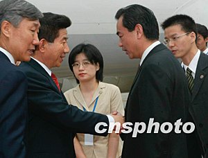 韓國總統(tǒng)盧武鉉七日飛抵北京開始其訪華行程,外交部副部長王毅前往機場迎接。中新社記者:滿會喬