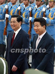 中國國家主席胡錦濤七日在北京舉行歡迎儀式,歡迎到訪的韓國總統(tǒng)盧武鉉一行。中新社記者:鄭萍萍