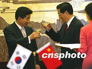 中國國家主席胡錦濤與韓國總統(tǒng)盧武鉉七日在北京共同出席雙方多個(gè)合作協(xié)議的簽字儀式。中新社記者:滿會(huì)喬