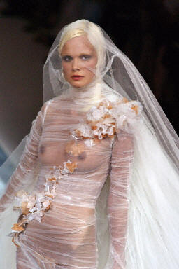 7月9日在巴黎2003/04秋冬時尚女裝時裝周上,一位模特現(xiàn)場展示了Jean-Paul Gaultier設(shè)計的性感透明婚紗。
