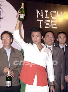 歌星謝霆鋒7月10日在香港出席其唱片《Re born》祝捷會,《Re born》推出壹個月在中、港、臺、星、馬各地獲歌迷熱烈支持,共賣出三十萬張獲得六白金唱片榮譽。謝霆鋒在祝捷會上高舉香檳慶祝。作者:鄧慶樂