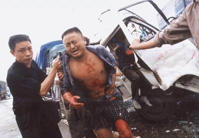 在現(xiàn)場(chǎng),聚集在受損最為嚴(yán)重的川M05049小貨車周圍的司機(jī)此刻也動(dòng)手救助卡在駕駛室里的同行。要救人就必須移開小貨車前面那輛大貨車,但它已經(jīng)無法發(fā)動(dòng),“我來試試!”排在第一的東風(fēng)大貨車司機(jī)從破裂的車窗翻進(jìn)駕駛室,汽車被發(fā)動(dòng)了!車輪在一厘米一厘米地前移,因猛烈撞擊已經(jīng)交錯(cuò)纏繞在一起的車體鋼板發(fā)出分離時(shí)的撕裂聲,川M05049已成麻花的駕駛室漸漸被移動(dòng)的前車扯高,當(dāng)最后一塊鋼板脫離時(shí),駕駛室轟然落下,被卡的3名傷者同時(shí)高聲喊疼。7時(shí)42分大家奮力拉開變形車門,將馬偉和劉德志抱出了險(xiǎn)境。重傷者記者鼓勵(lì)堅(jiān)持下去