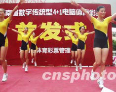 七月十二日,海南省率先在全國推出“四加一”體育彩票新玩法。在?诮鹗兰o(jì)廣場舉行的首發(fā)儀式上,模特跳舞表演助興。作者:王辛莉