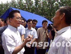 10時(shí)50分,總理又來到前進(jìn)村災(zāi)民點(diǎn)。在68歲的村民李兆業(yè)家,王金山省長(zhǎng)說:“老人家,總理來看你了!崩钫讟I(yè)一邊說:“謝謝總理關(guān)心”,一邊搬凳子請(qǐng)總理坐。細(xì)心的總理看老人腿不好,讓李兆業(yè)先找凳子坐下,自己才落座,并開始詢問情況。“搬這兒來,缺不缺吃的、用的?”總理問!安蝗,政府都給了!崩先舜!岸冀o了些什么呀?”“發(fā)了米、面粉、方便面、油、煤、蚊香,還有其他東西。”“身體還好嗎?有沒有毛?”“身體還好,就是有點(diǎn)老毛病。”“就你們老兩口嗎?孩子來看你沒有?”“兒子到杭州打工去了!薄皟鹤又滥銈冞@兒鬧水災(zāi)了嗎?可打電話來,給二老寄錢沒有?”“兒子知道遭災(zāi)了,打電話回來了,還沒到寄錢的時(shí)候……”總理仔細(xì)地問,老人一一回答,仿佛是親朋好友在拉家常。總理臨走時(shí)握著李兆業(yè)的手說:“我來看看你,代表黨中央、國務(wù)院,代表胡錦濤總書記和軍委江澤民主席來看你。知道你們生活安排得好,我就放心了!崩钫讟I(yè)激動(dòng)地說:“感謝黨和政府,感謝總理的關(guān)心!