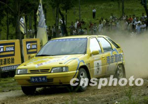2003年中國汽車?yán)惖诙颈荣?6日在吉林省長春市雙陽區(qū)舉行,來自全國的56輛賽車參加本次比賽,46輛賽車完成了第一天的比賽,圖為曾在第一站比賽中駕駛東風(fēng)雪鐵龍·神龍富康車的北京海駕車手周勇在比賽中。中新社記者:趙振清