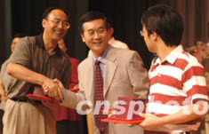 首都醫(yī)科大學宣武醫(yī)院院長張建(中),十八日在北京舉行的“宣武醫(yī)院抗擊SARS大捷慶功大會”上,向新華社、人民日報等參與采訪抗擊SARS一線醫(yī)護人員的三名記者,授予宣武醫(yī)院永久院員榮譽稱號,并頒發(fā)證書和獎品。中新社記者:鄒憲