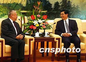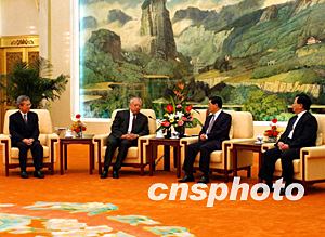 中國(guó)國(guó)家主席胡錦濤和副主席曾慶紅,七月十九日在北京人民大會(huì)堂會(huì)見(jiàn)香港特首董建華和行政長(zhǎng)官辦公室主任林煥光。中新社記者:賈國(guó)榮  胡錦濤主席與香港特首董建華交談。中新社記者:賈國(guó)榮