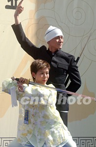 香港巨星劉德華、武術名家李暉,七月十九日在香港舉行的“諾基亞6108揮筆舞劍創(chuàng)記錄”慈善活動上,率五百人寫書法及耍太極劍齊創(chuàng)健力士記錄。中新社記者:錢興強