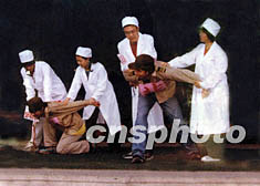 北京首都醫(yī)科大學(xué)的大學(xué)生們,近日在學(xué)校大禮堂舞臺(tái)演出活報(bào)劇《抗“非典”》。圖為身穿醫(yī)療防護(hù)裝的“醫(yī)護(hù)人員”將“非典病毒”捉拿歸案,以示正法。作者:首醫(yī)