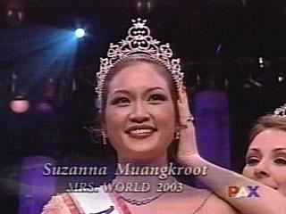 來自全球39位佳麗齊聚美國拉斯維加斯,為爭取2003年世界小姐的桂冠寶使出混身解數(shù)。來自泰國的蘇珊娜在機(jī)智問答中,以沉著穩(wěn)重的氣度舒展大將之風(fēng),她被問到的題目是為什么希望成為世界小姐,她回答:“因?yàn)槲抑来魃狭嘶使诰透队栉沂嬲宫F(xiàn)代女子的能力,無論在泰國、美國、或任何地方,展示出我們高貴有教養(yǎng),有能力,并展示我們很愛家人有高道德!