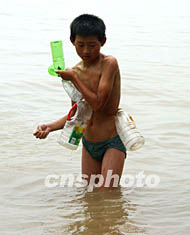 一名小男孩在淮河洪水中身綁自制的塑料飲料瓶救生衣,他家位于安徽省南市郊,七月被洪水圍困在堤上。中新社記者:賈國(guó)榮