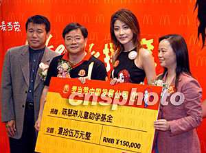 麥當(dāng)勞“搖滾薯條”形象代言人陳慧琳七月二十二日下午現(xiàn)身廣州,在海珠廣場麥當(dāng)勞分店參加了一系列的推廣活動。當(dāng)天廣東三元麥當(dāng)勞公司向陳慧琳兒童基金捐款十五萬元人民幣。作者:梁永強(qiáng)