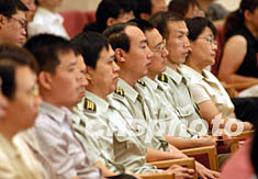 中國(guó)新聞界抗擊非典宣傳工作表彰會(huì)二十三日在北京人民大會(huì)堂舉行,解放軍記者參加會(huì)議。中新社記者:張宇