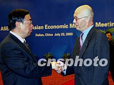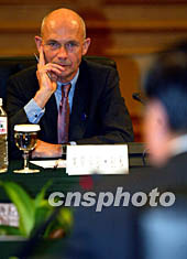 出席七月中國大連第五屆亞歐經(jīng)濟部長會議的歐盟委員會貿(mào)易委員拉米,與中國商務部部長呂福源就世界貿(mào)易組織新一輪多邊貿(mào)易談判的有關議題深入交換了意見。 中新社記者:鄭萍萍