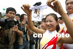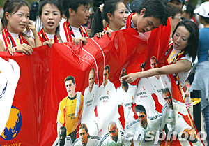 而在皇馬抵達(dá)昆明之前,就有兩位紅塔女工為了歡迎皇馬巨星,用了整整一個禮拜親手縫制二十多件印有貝克漢姆、齊達(dá)內(nèi)、勞爾等舉行頭像的小T恤。今天一早,這兩位女工又隨著大部隊從玉溪趕往昆明迎接皇馬!澳軌蛴H眼看到皇馬的球員就心滿意足了!眱晌慌さ囊蟮共皇呛芨摺