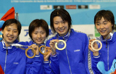 27日,中國游泳隊在巴塞羅那世界游泳錦標賽,奪得了女子四乘一百米混合泳接力賽的冠軍,中國姑娘還以三分五十九秒八九的成績打破了世錦賽的賽會紀錄,并且如愿拿到了這枚份量最重的金牌。(圖左起)戰(zhàn)殊、羅雪娟、周雅菲和楊雨登上領獎臺。